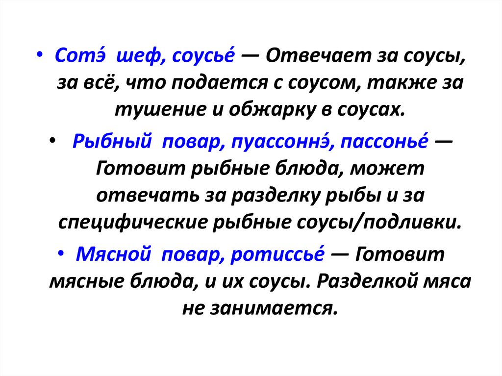 • Сотэ́ шеф, соусье́ — Отвечает за соусы,за всё, что подается с соусом, также за