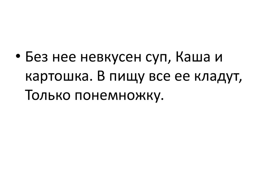 • Без нее невкусен суп, Каша икартошка. В пищу все ее кладут,