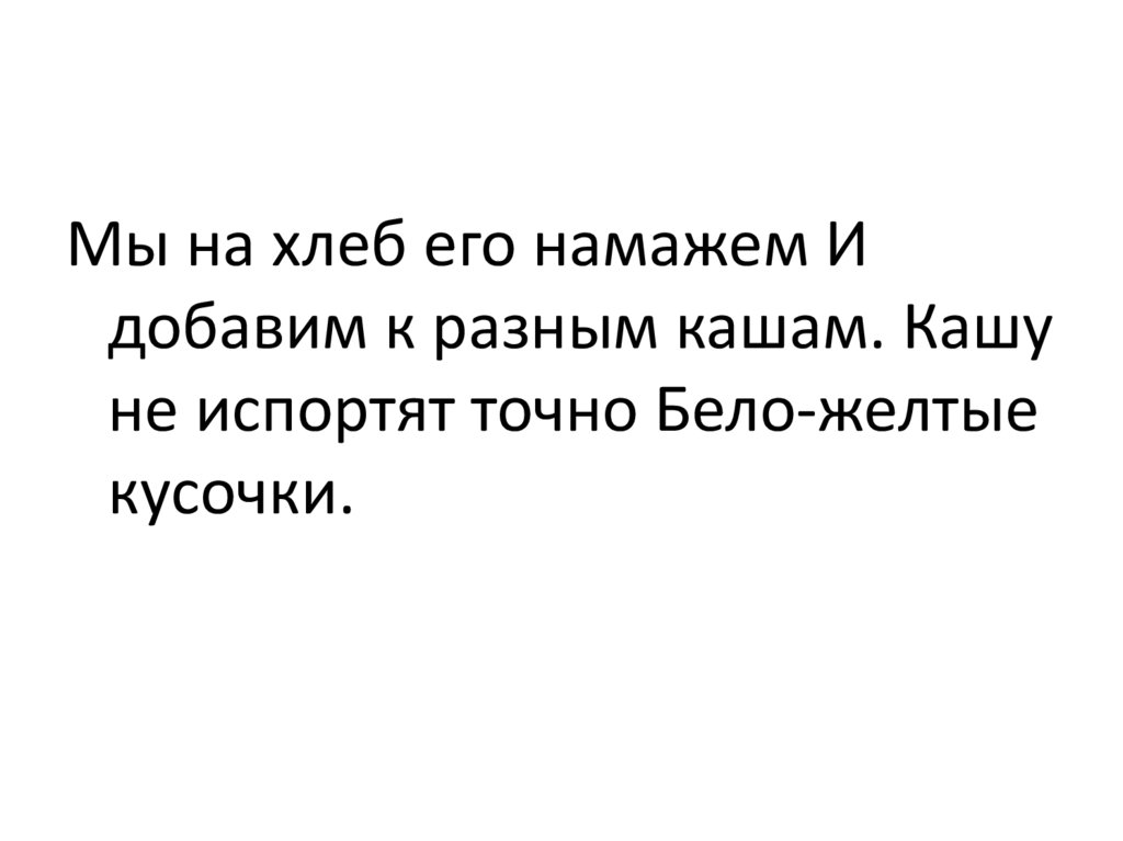 Мы на хлеб его намажем Идобавим к разным кашам. Кашу