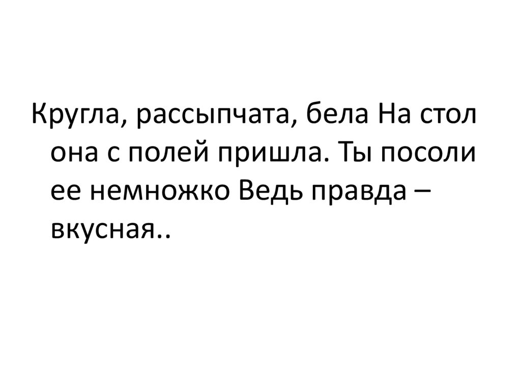 Кругла, рассыпчата, бела На столона с полей пришла. Ты посоли