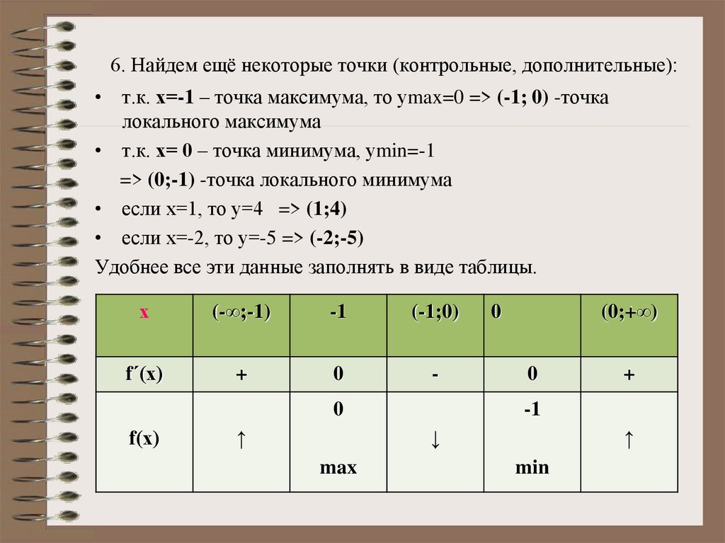 6. Найдем ещё некоторые точки (контрольные, дополнительные):• т.к. х=-1 – точка максимума, то уmax=0 => (-1; 0) -точка