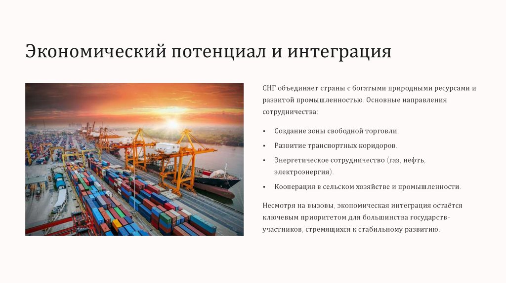 Экономический потенциал и интеграцияСНГ объединяет страны с богатыми природными ресурсами и