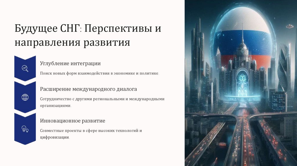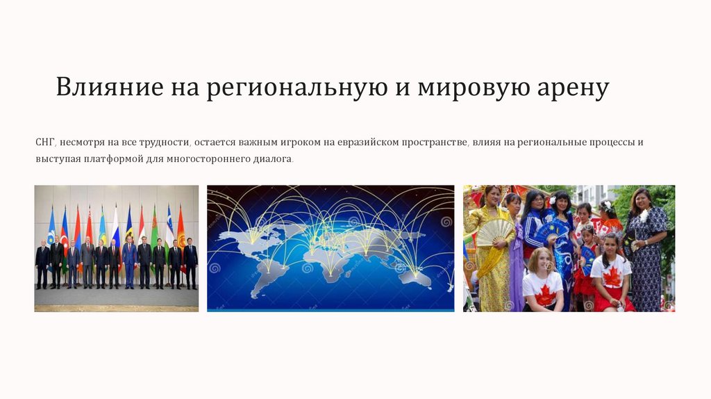 Влияние на региональную и мировую аренуСНГ, несмотря на все трудности, остается важным игроком на евразийском пространстве, влияя на региональные процессы и