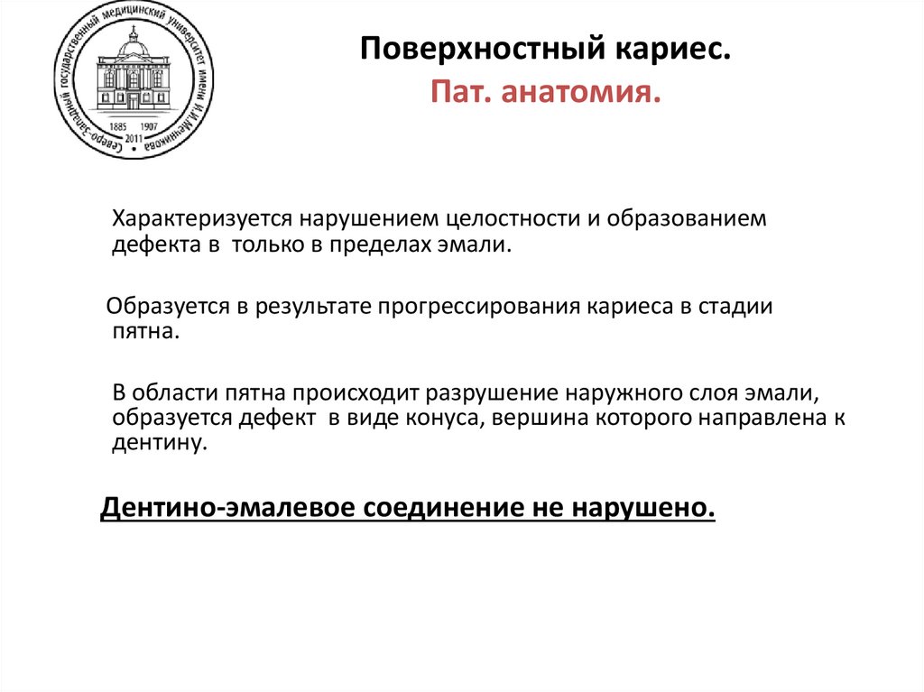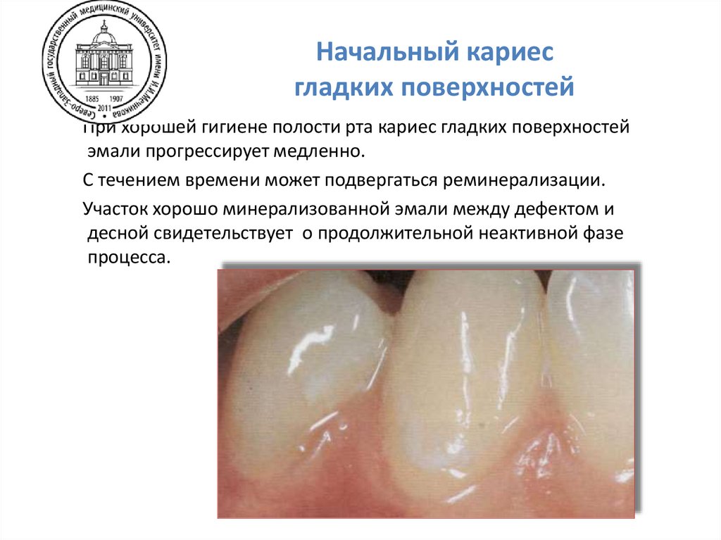 Кариес на стадии пятна не имеет деструкции эмали, целостность
