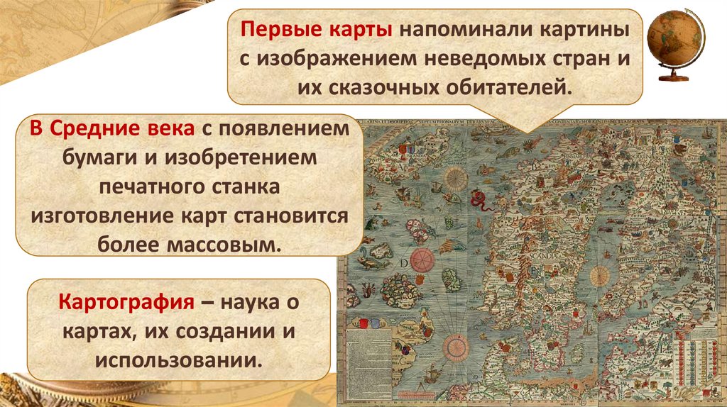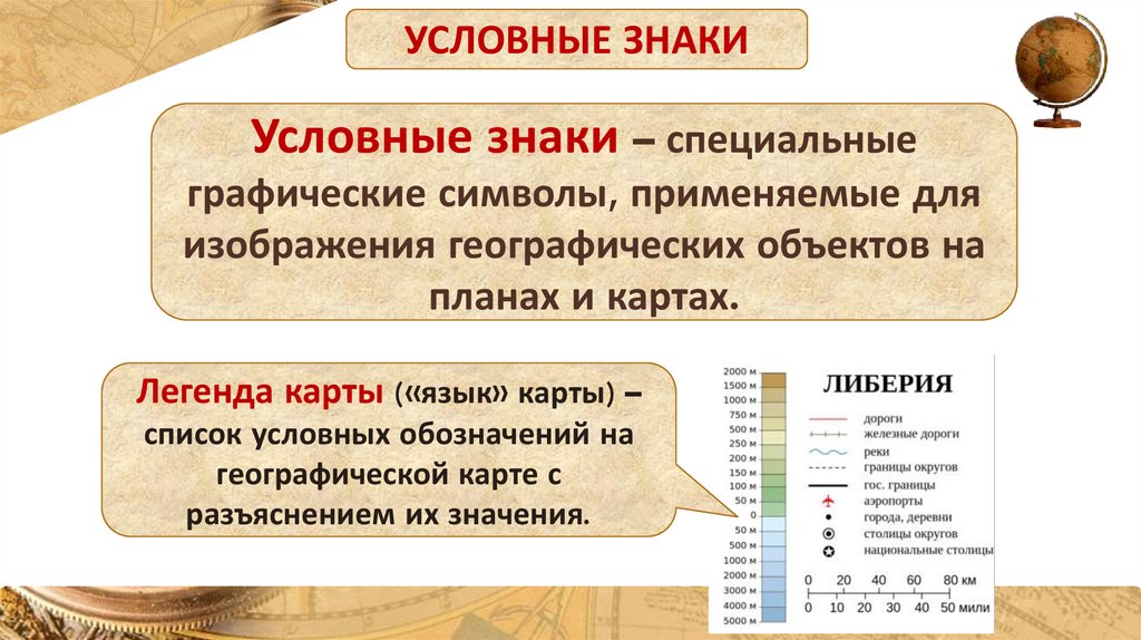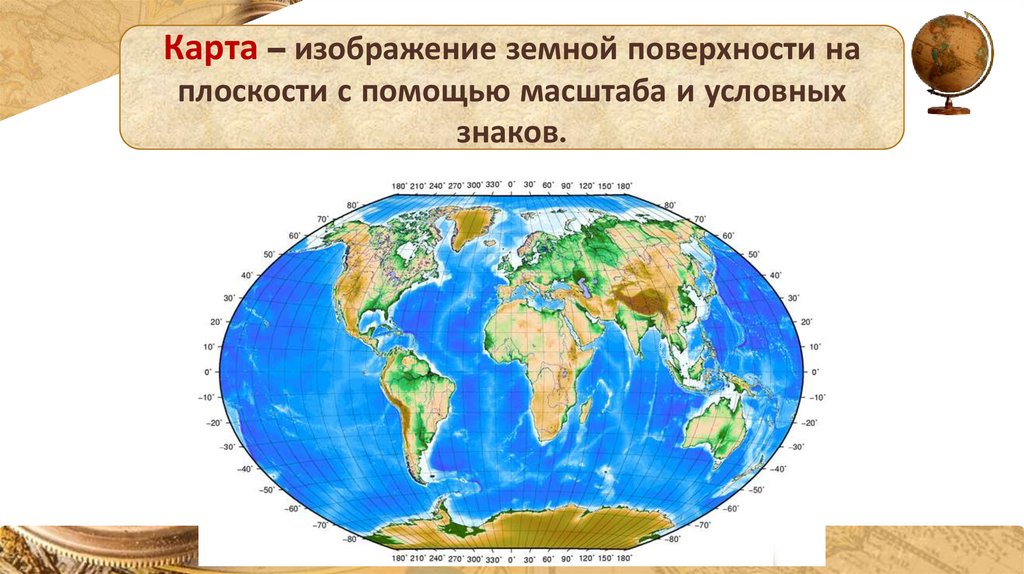 Карта – изображение земной поверхности наплоскости с помощью масштаба и условных