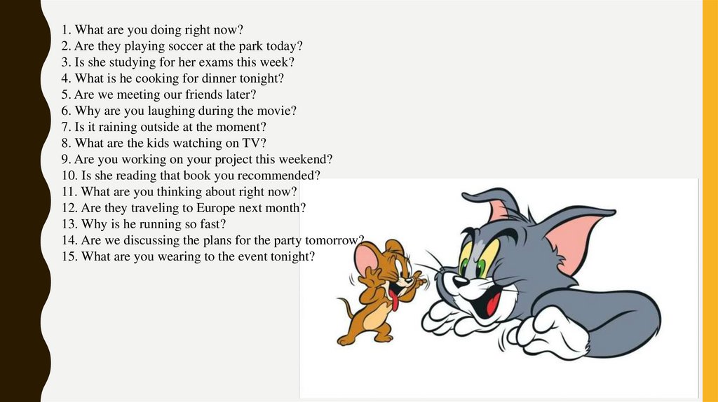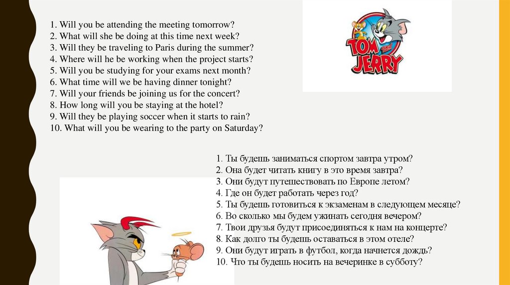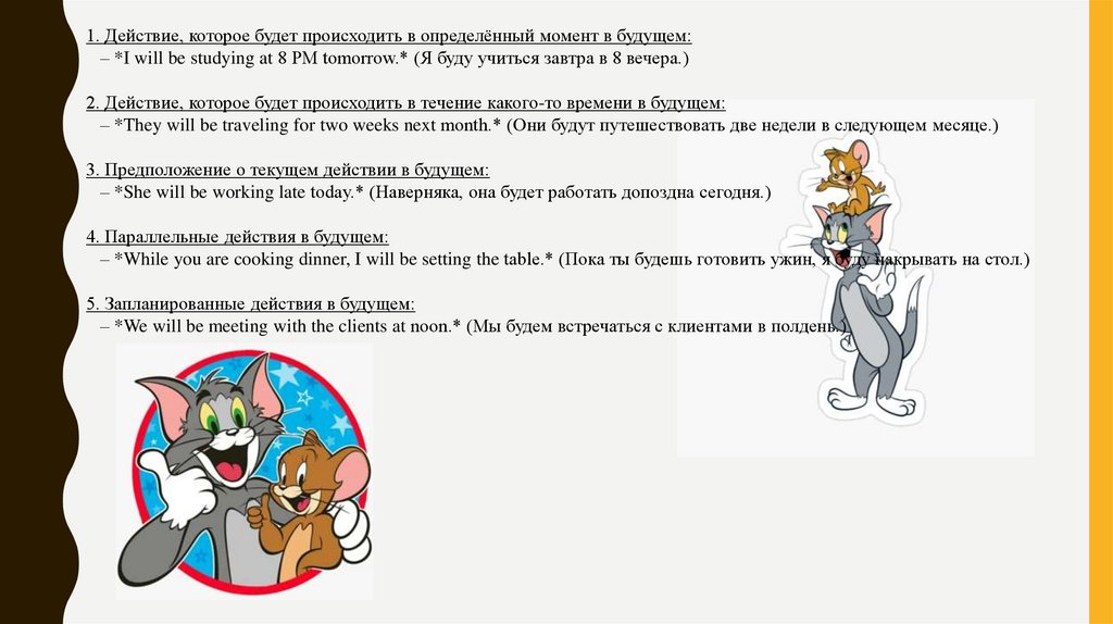 1. Действие, которое будет происходить в определённый момент в будущем:– *I will be studying at 8 PM tomorrow.* (Я буду учиться завтра в 8 вечера.)