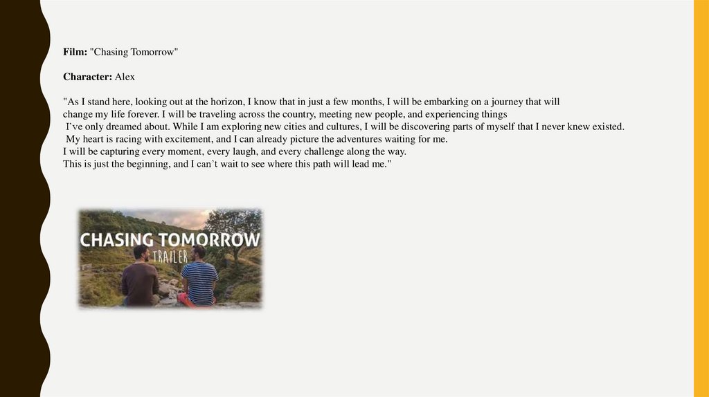 Film: "Chasing Tomorrow"Character: Alex