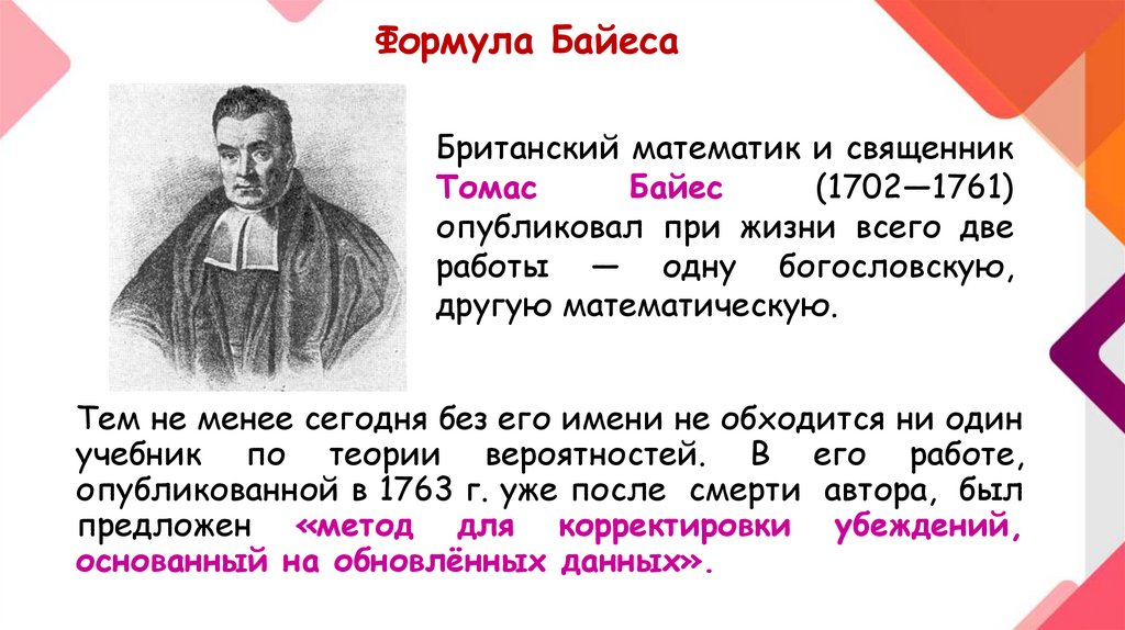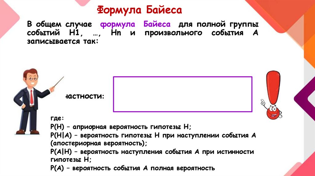 Формула БайесаФормулу Байеса, как и формулу полной вероятности,
