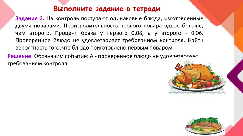 Выполните задание в тетрадиЗадание 2. На контроль поступают одинаковые блюда, изготовленные