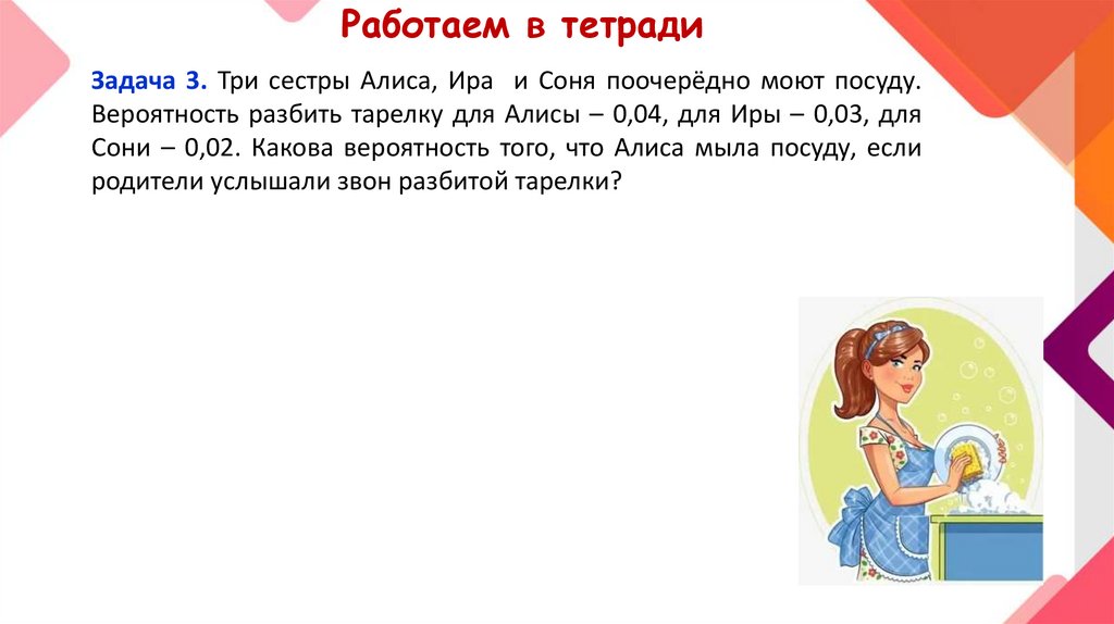 Работаем в тетрадиЗадача 3. Три сестры Алиса, Ира и Соня поочерёдно моют посуду.