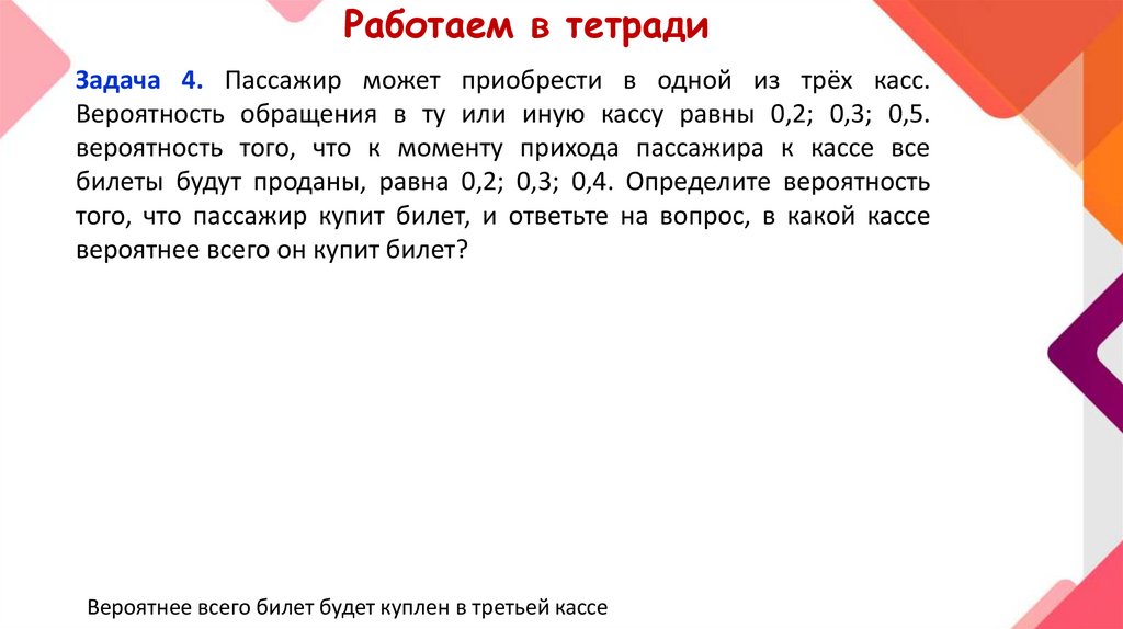 Работаем в тетрадиЗадача 4. Пассажир может приобрести в одной из трёх касс.