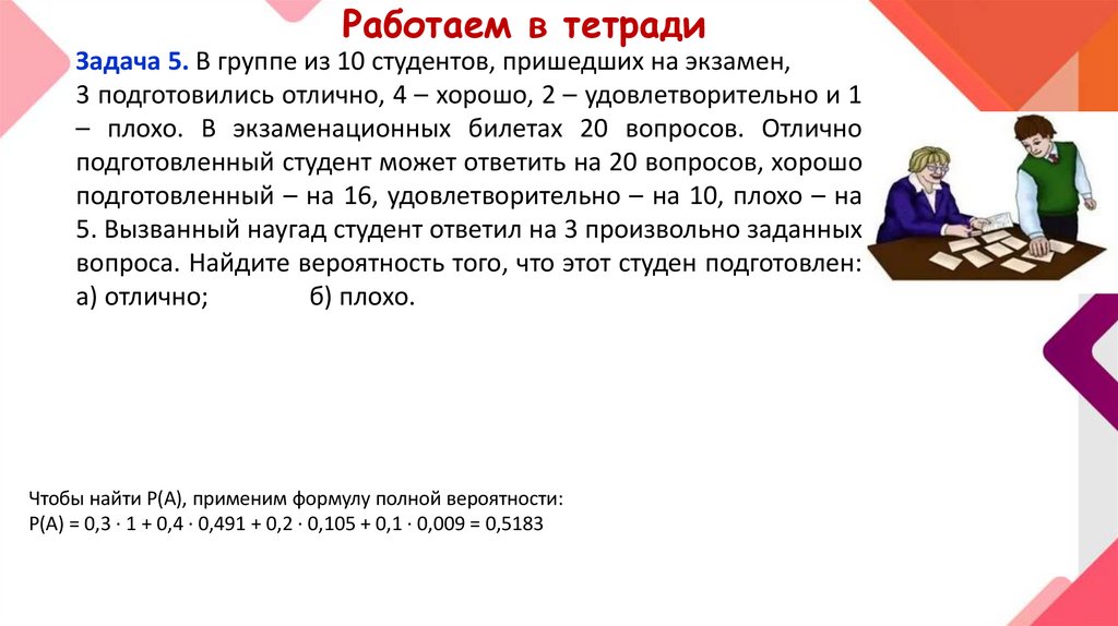 Работаем в тетрадиЗадача 5. В группе из 10 студентов, пришедших на экзамен,