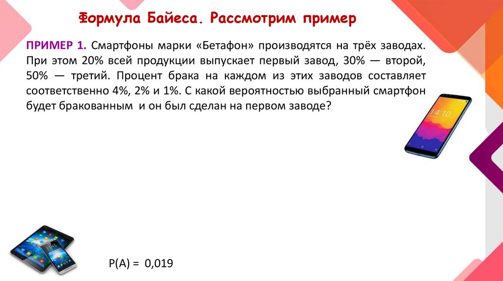 Формула Байеса. Рассмотрим примерПРИМЕР 1. Смартфоны марки «Бетафон» производятся на трёх заводах.