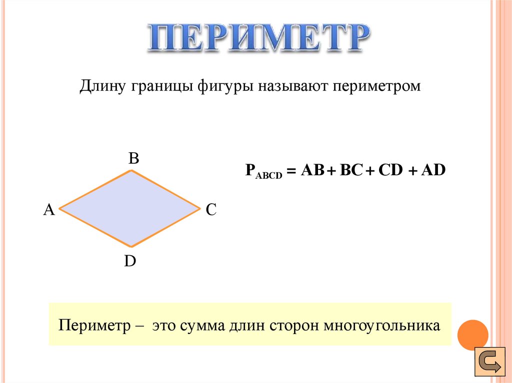 18. 3. Сумму длин всех сторон многоугольника называют: 1) площадь, 2) периметр, 3) диагональ