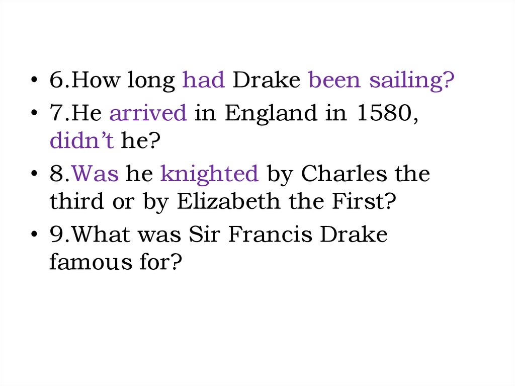 • 6.How long had Drake been sailing?• 7.He arrived in England in 1580,