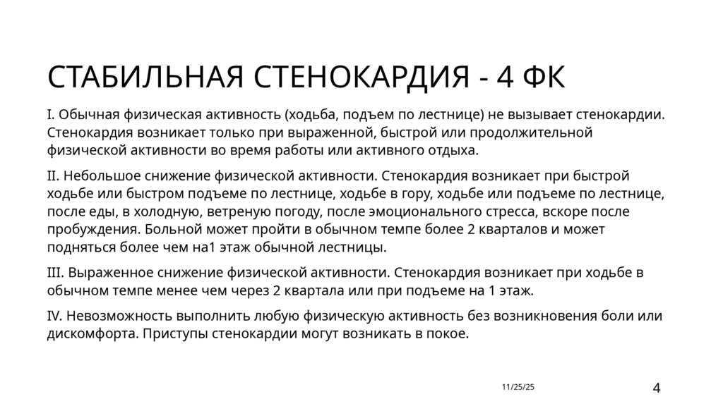 СТАБИЛЬНАЯ СТЕНОКАРДИЯ - 4 ФКI. Обычная физическая активность (ходьба, подъем по лестнице) не вызывает стенокардии.