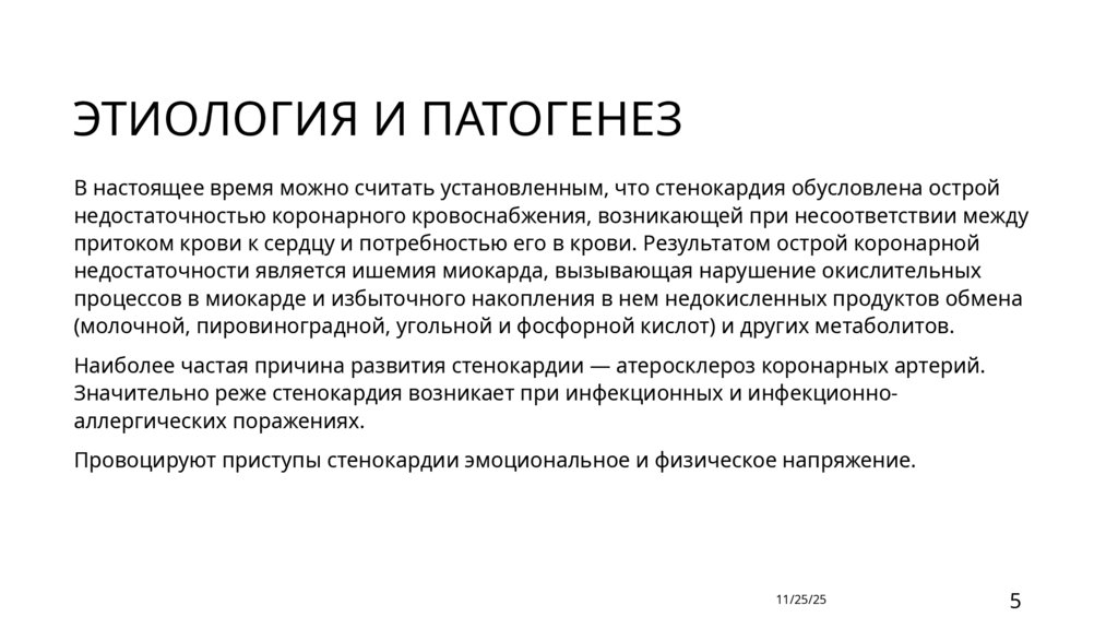 ЭТИОЛОГИЯ И ПАТОГЕНЕЗВ настоящее время можно считать установленным, что стенокардия обусловлена острой