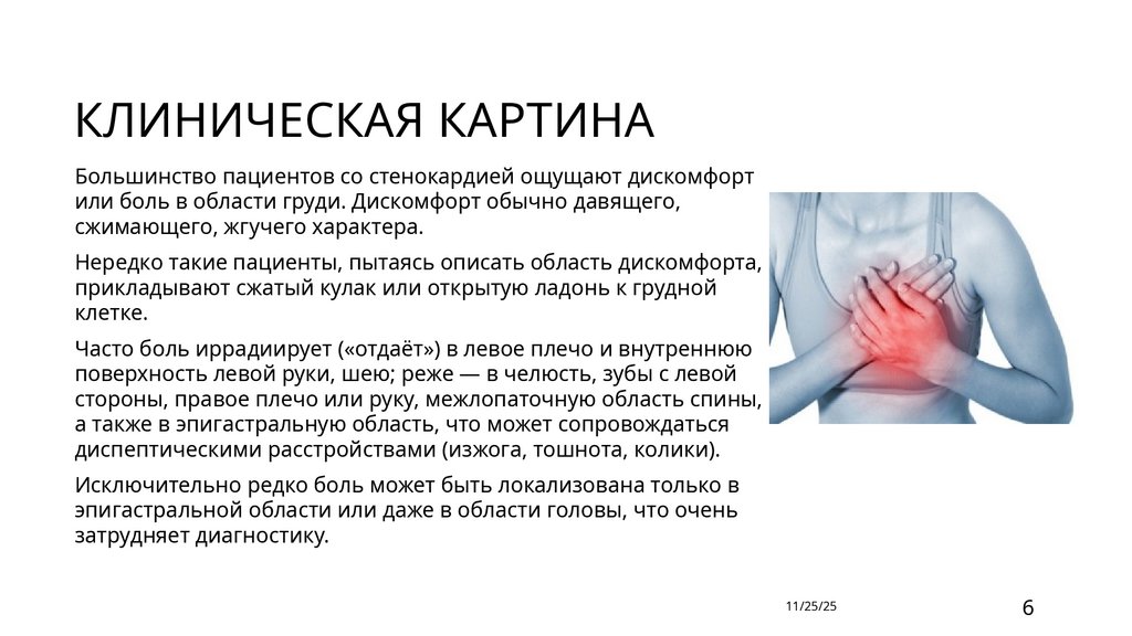 дискомфорта. Приступы стенокардии могут возникать в покое.