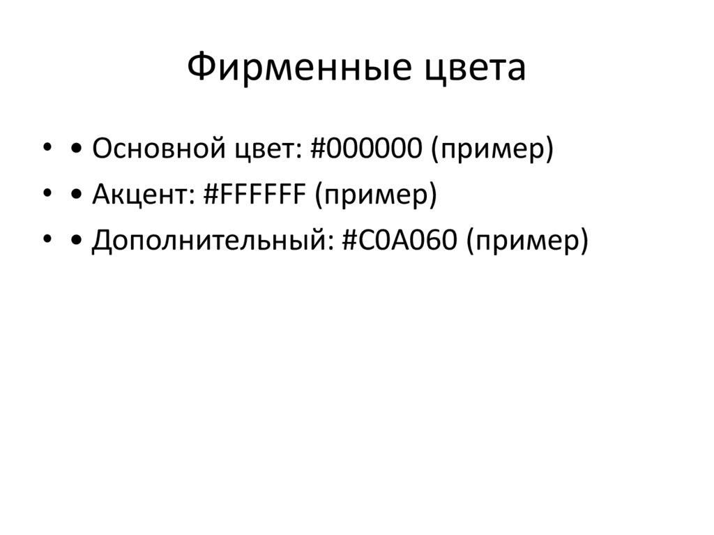 Фирменные цвета• • Основной цвет: #000000 (пример)
