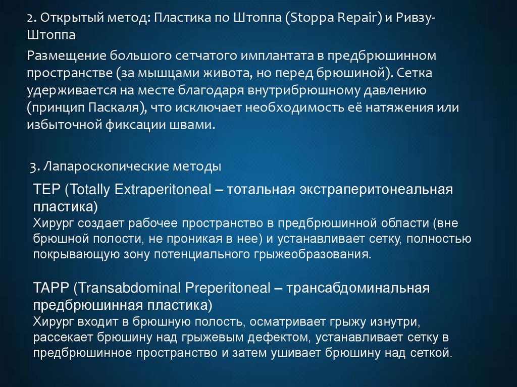 2. Открытый метод: Пластика по Штоппа (Stoppa Repair) и РивзуШтоппаРазмещение большого сетчатого имплантата в предбрюшинном