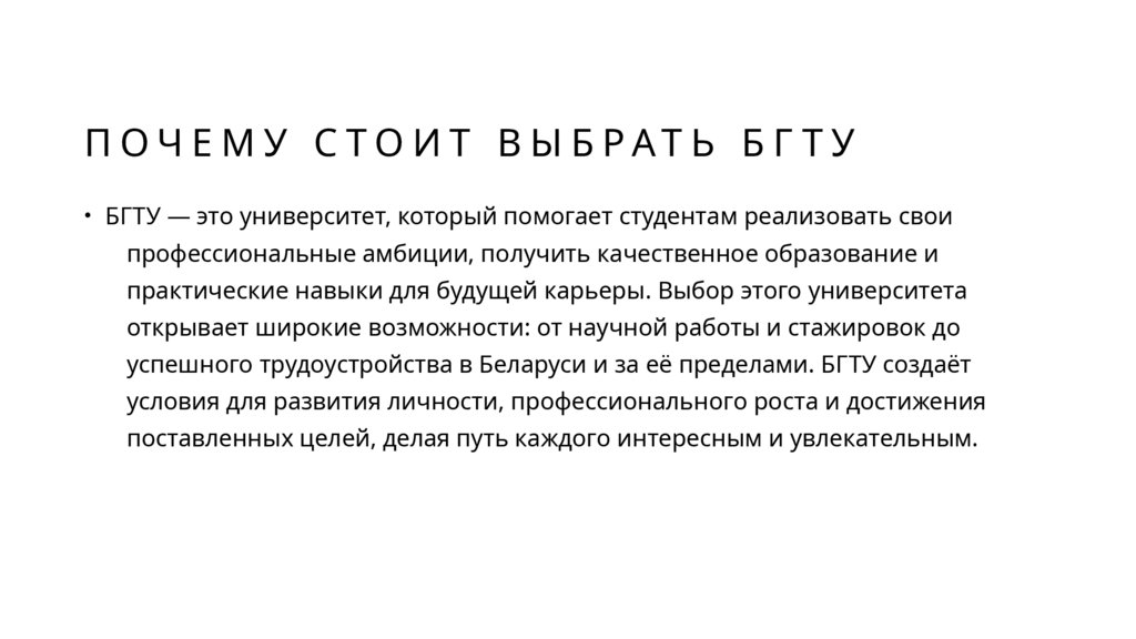 П О Ч Е М У С Т О И Т В Ы Б РАТ Ь Б Г Т У• БГТУ — это университет, который помогает студентам реализовать свои