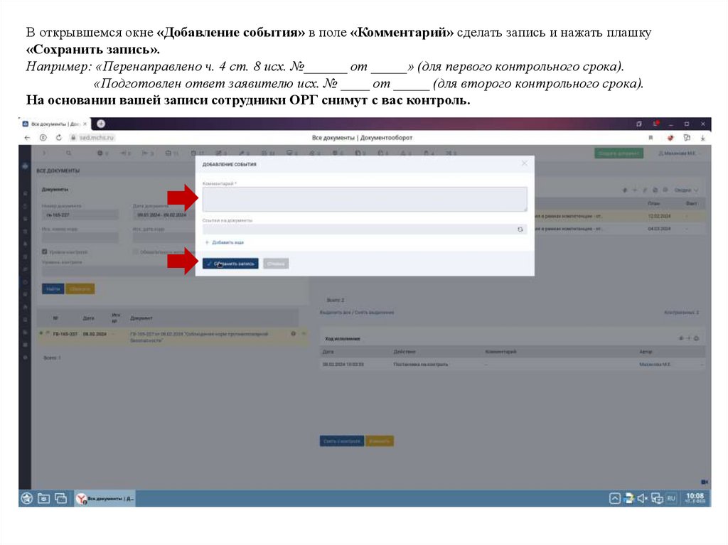 В открывшемся окне «Добавление события» в поле «Комментарий» сделать запись и нажать плашку«Сохранить запись».