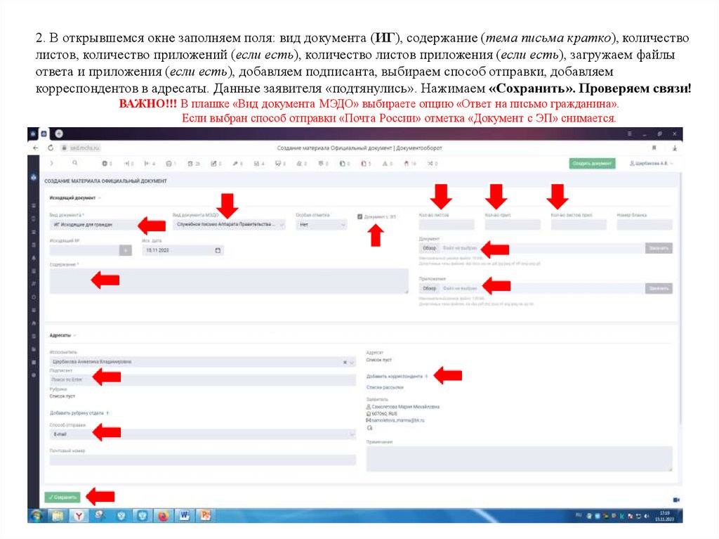 ВАЖНО!!! В плашке «Вид документа МЭДО» выбираете опцию «Ответ на письмо гражданина».