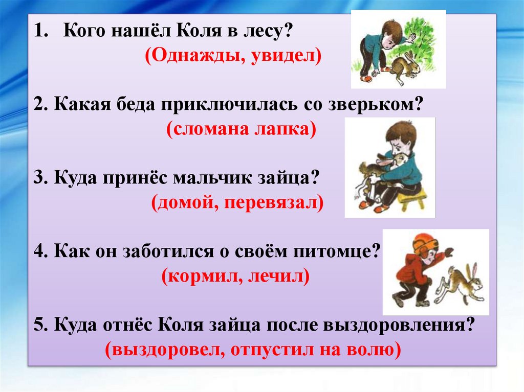 1. Кого нашёл Коля в лесу?(Однажды, увидел)