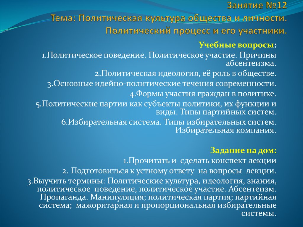 1. Занятие №12 Тема: Политическая культура общества и личности. Политический процесс и его участники.