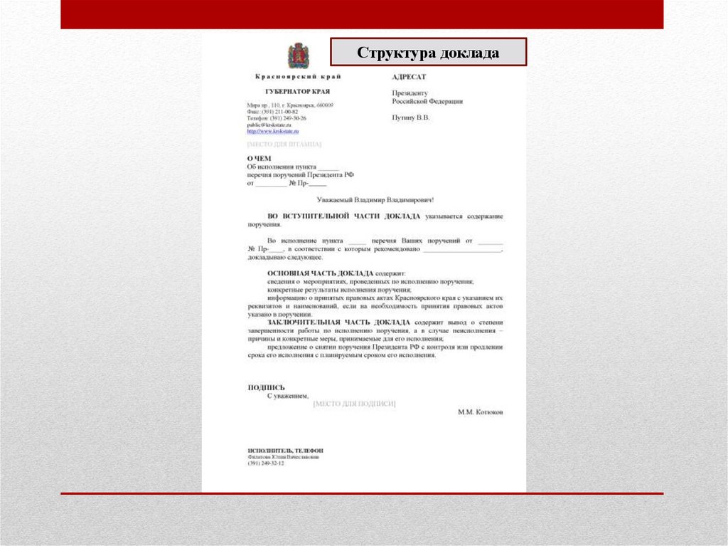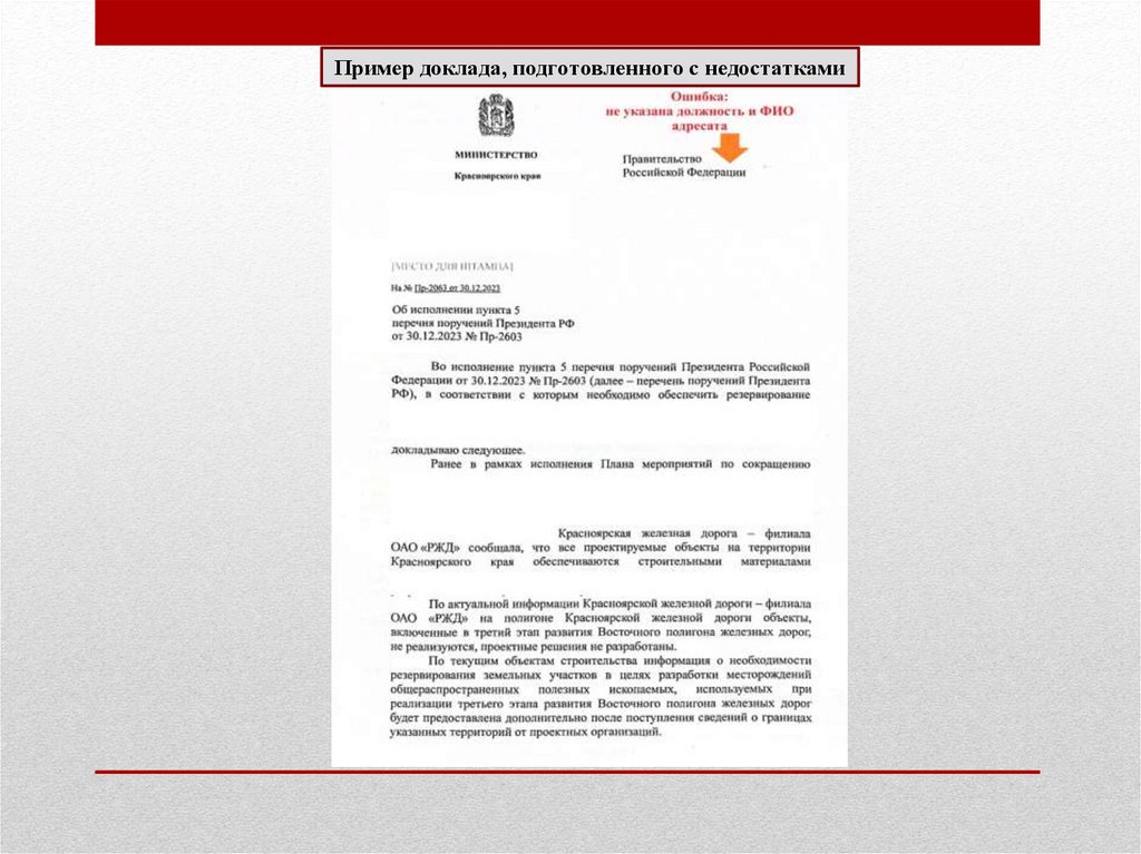 не отражены результаты исполнения поручения, использование в докладе