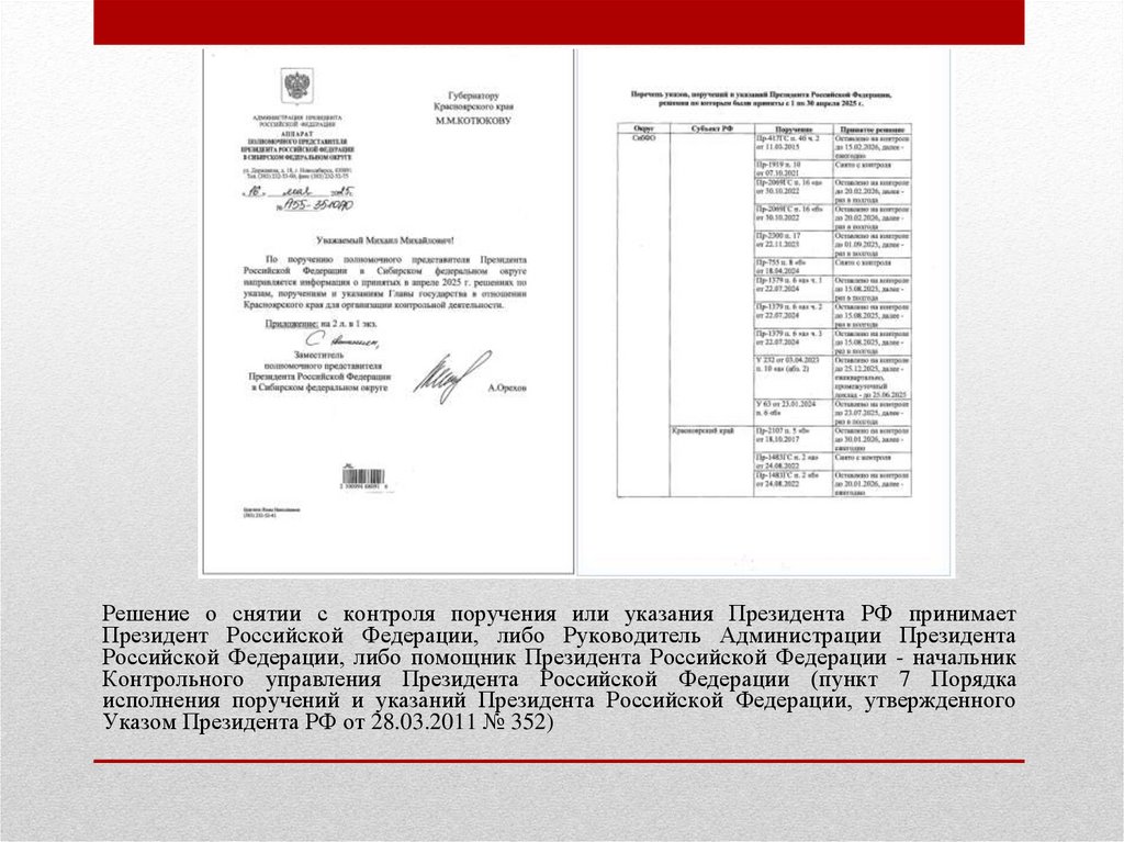 Решение о снятии с контроля поручения или указания Президента РФ принимаетПрезидент Российской Федерации, либо Руководитель Администрации Президента