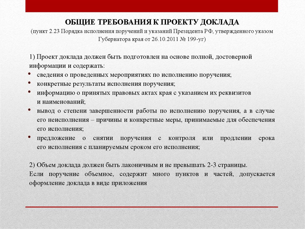 ОБЩИЕ ТРЕБОВАНИЯ К ПРОЕКТУ ДОКЛАДА(пункт 2.23 Порядка исполнения поручений и указаний Президента РФ, утвержденного указом