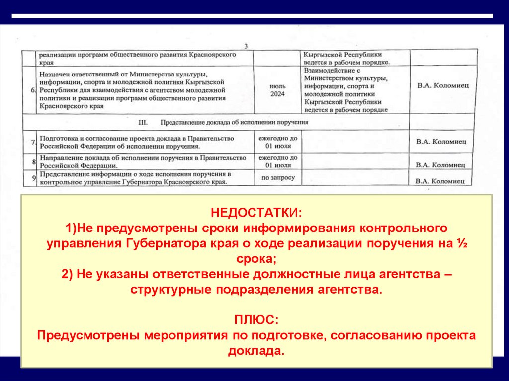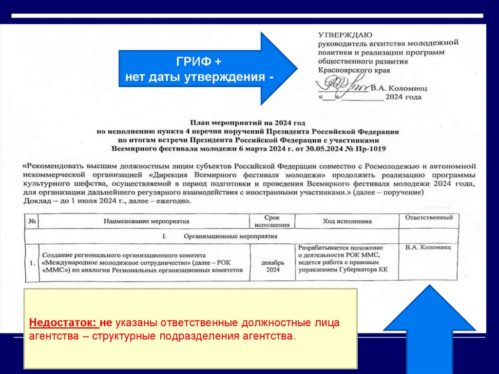 Недостатки: 1) Нет грифа об утверждении плана руководителем, виз соисполнителей;2) Указан неправильный срок направления доклада; 3) Мероприятие № 1 имеет обобщенный