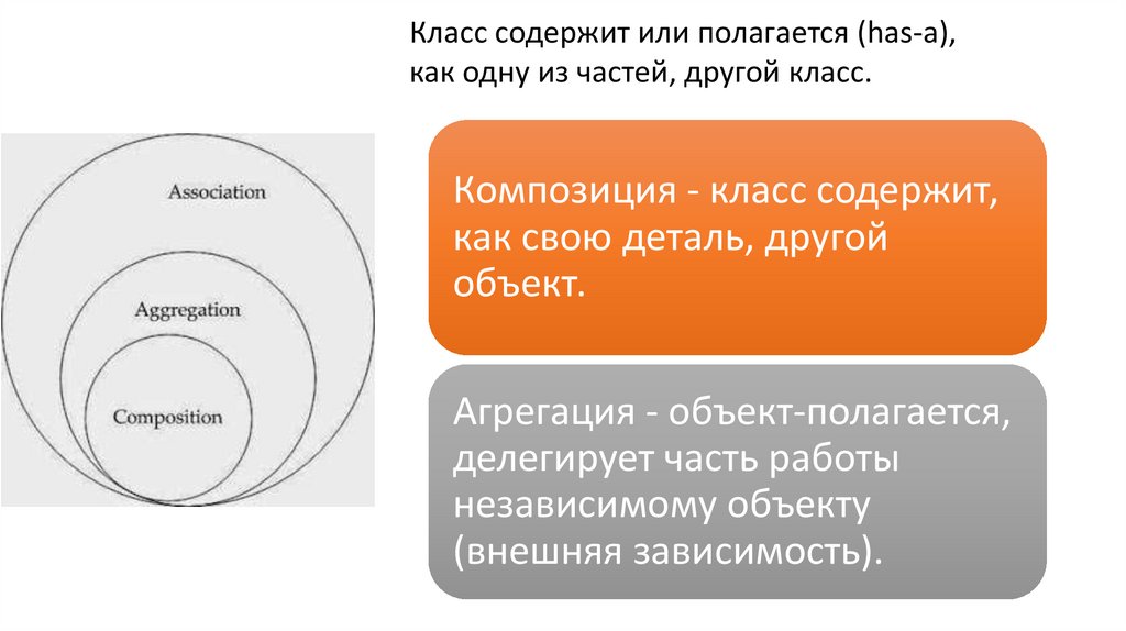 Класс содержит или полагается (has-a),как одну из частей, другой класс.