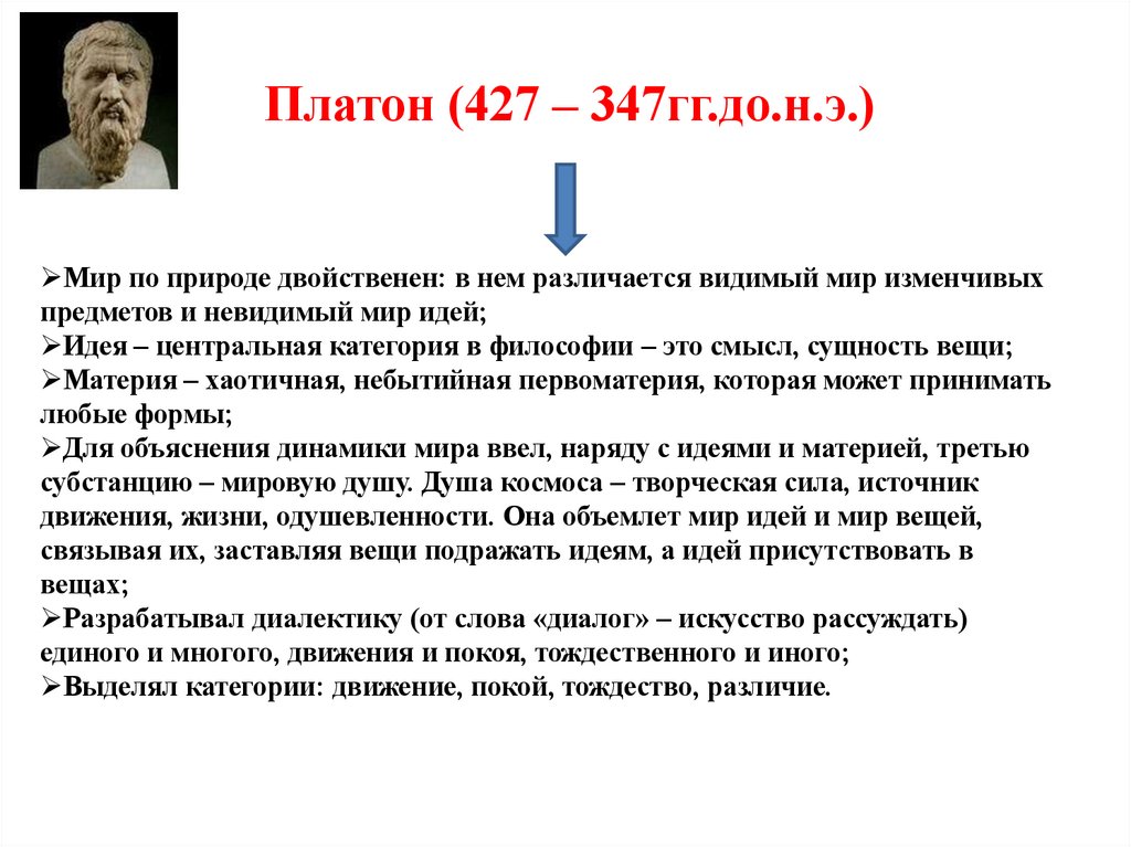 Платон (427 – 347гг.до.н.э.)Мир по природе двойственен: в нем различается видимый мир изменчивых