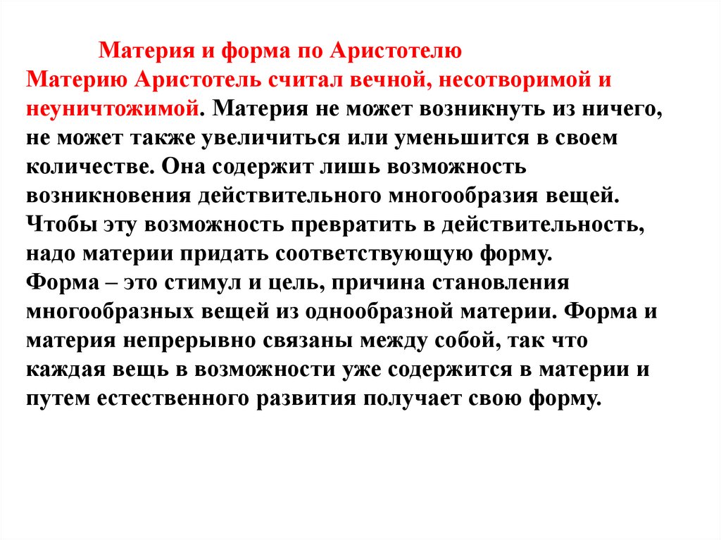 Материя и форма по АристотелюМатерию Аристотель считал вечной, несотворимой и