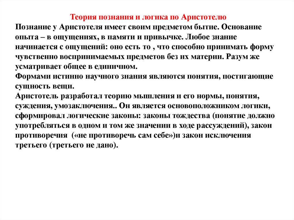 Аристотель разработал теорию мышления и его нормы, понятия,