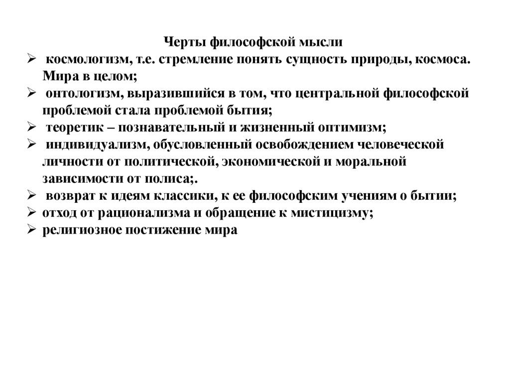 Черты философской мысликосмологизм, т.е. стремление понять сущность природы, космоса.
