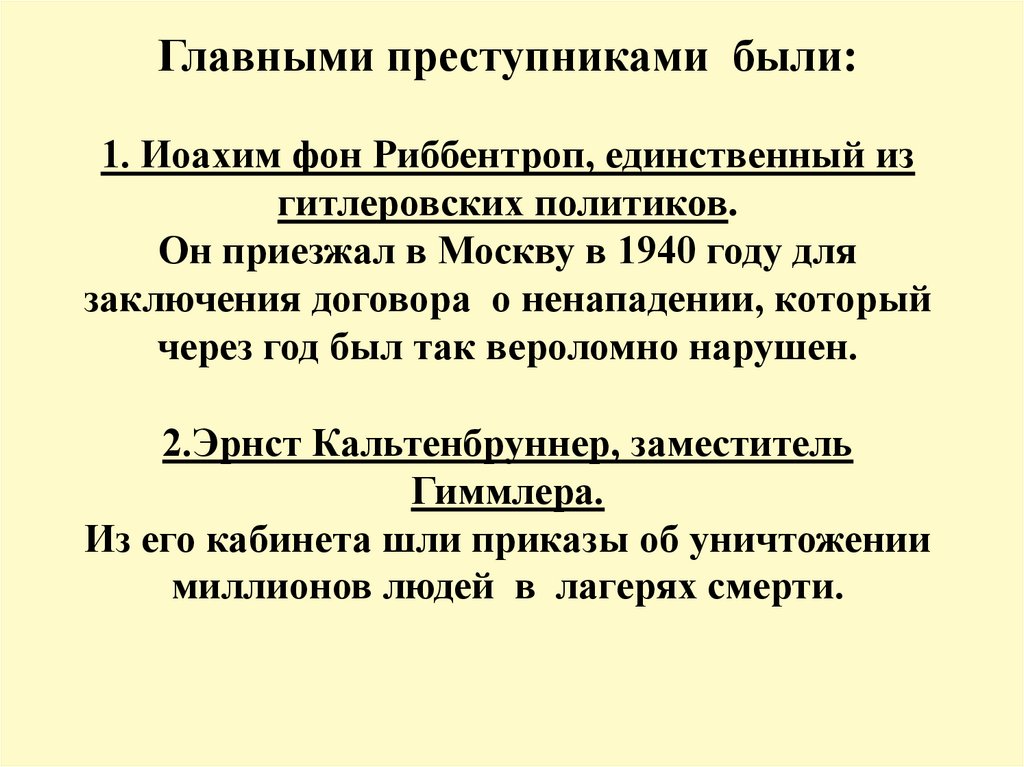 Главными преступниками были:1. Иоахим фон Риббентроп, единственный из