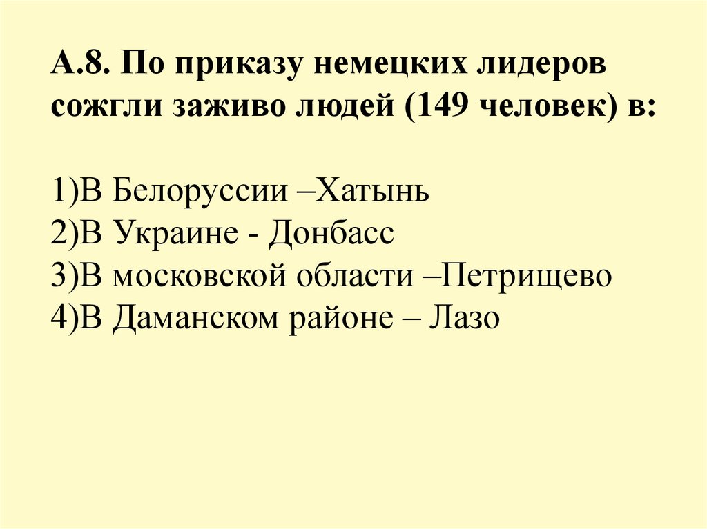 А.8. По приказу немецких лидеровсожгли заживо людей (149 человек) в: