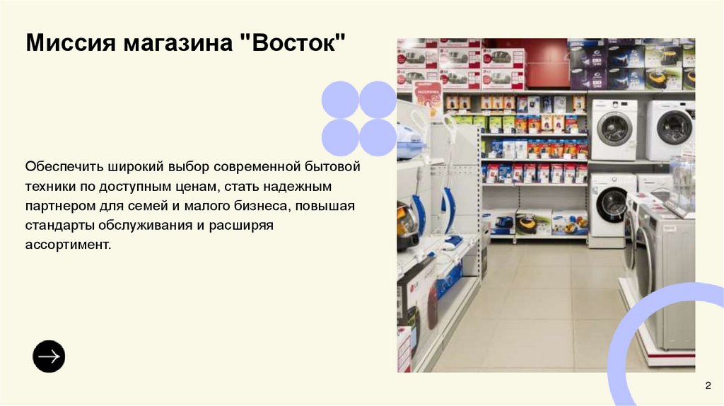 Миссия магазина "Восток"Обеспечить широкий выбор современной бытовой