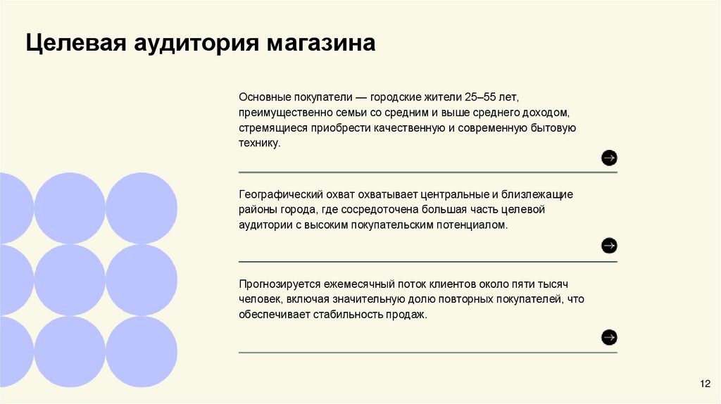 Целевая аудитория магазинаОсновные покупатели — городские жители 25–55 лет,