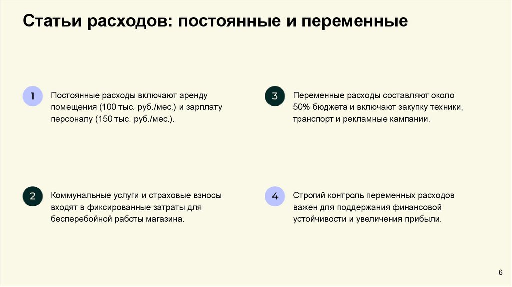 Статьи расходов: постоянные и переменныеПостоянные расходы включают аренду