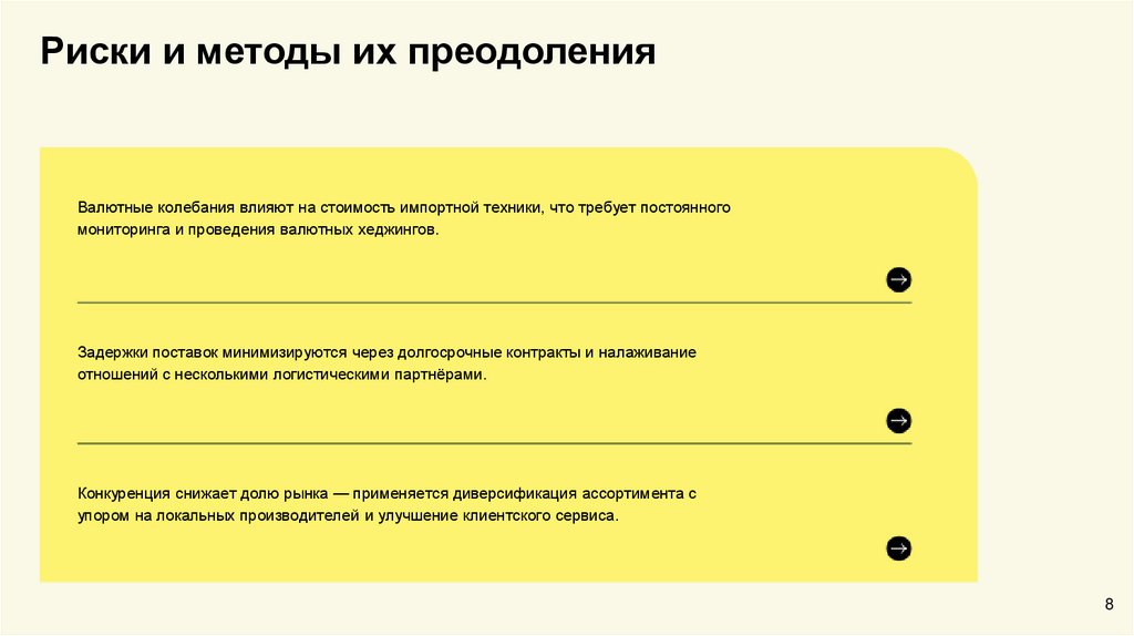 Риски и методы их преодоленияВалютные колебания влияют на стоимость импортной техники, что требует постоянного