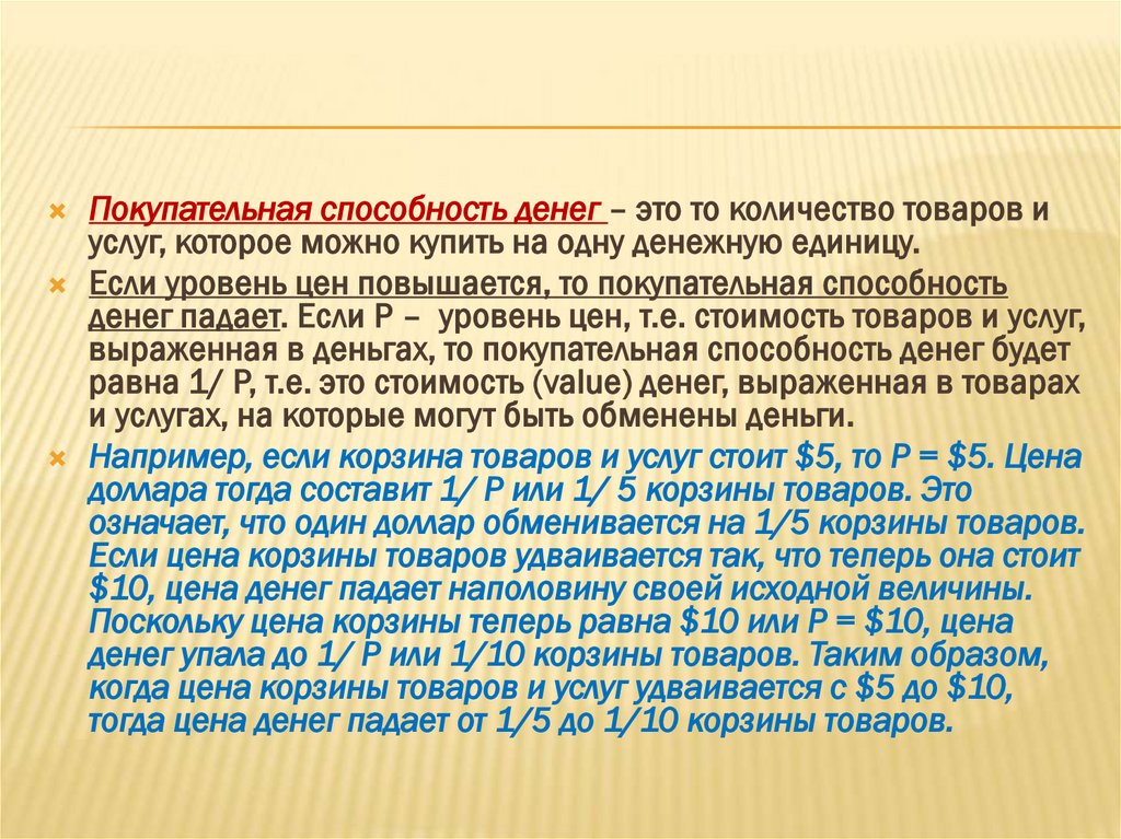 тогда цена денег падает от 1/5 до 1/10 корзины товаров.
