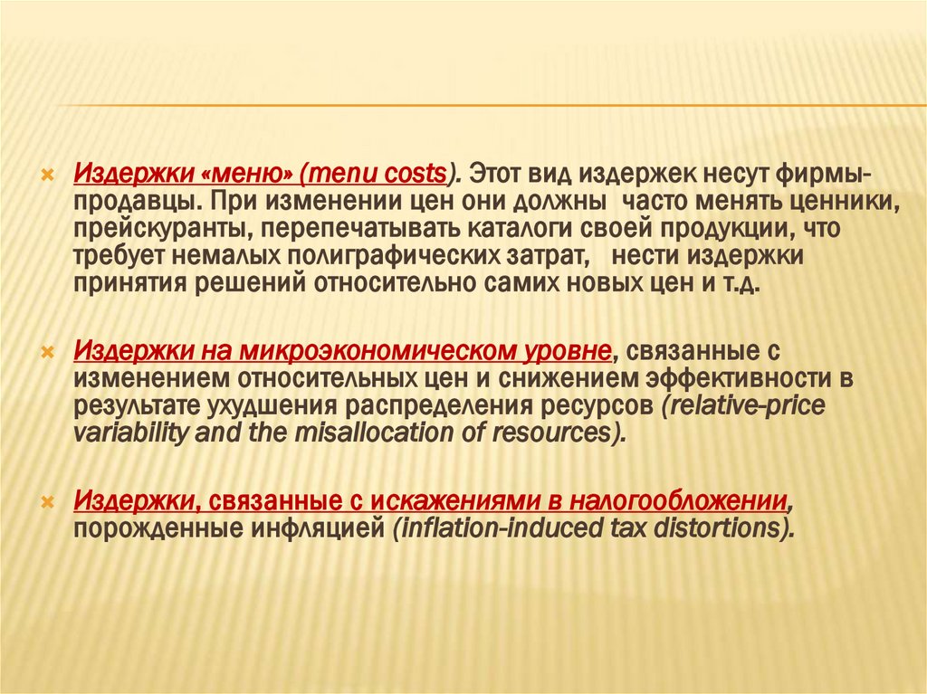 Издержки «меню» (menu costs). Этот вид издержек несут фирмыпродавцы. При изменении цен они должны часто менять ценники,прейскуранты, перепечатывать каталоги своей продукции, что