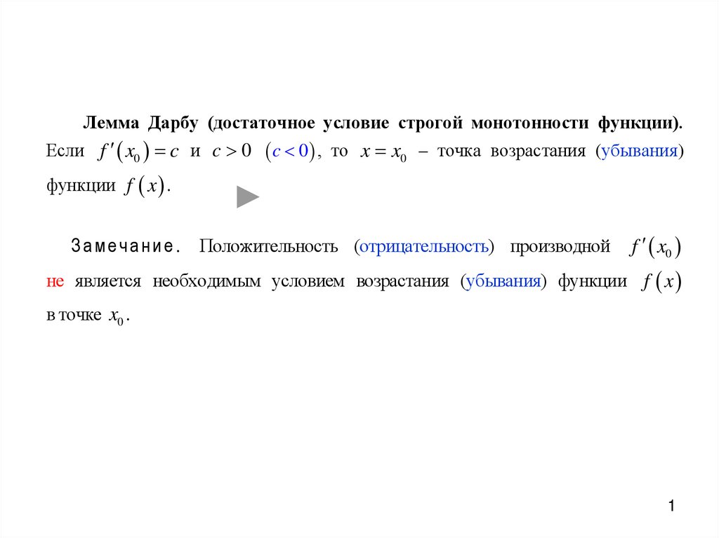 Лемма Дарбу (достаточное условие строгой монотонности функции).Если f x0 c и c 0