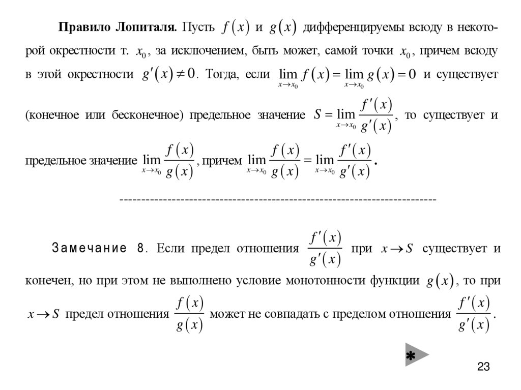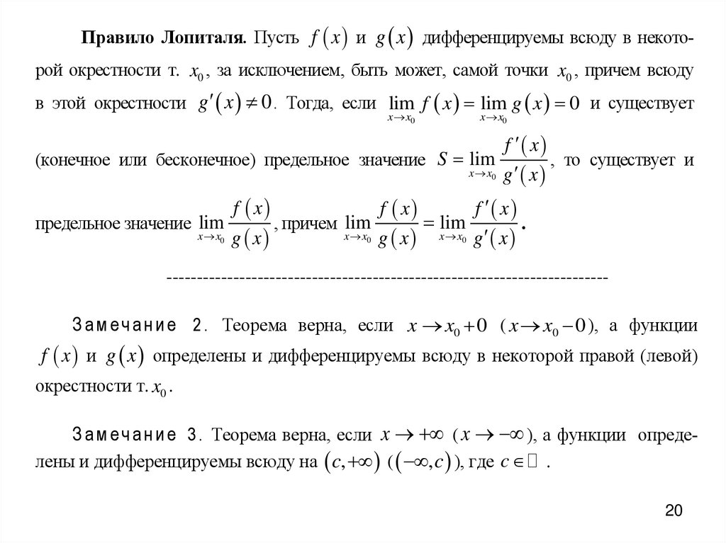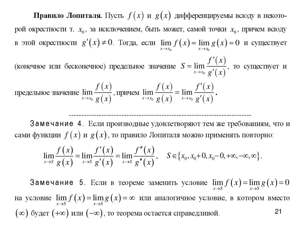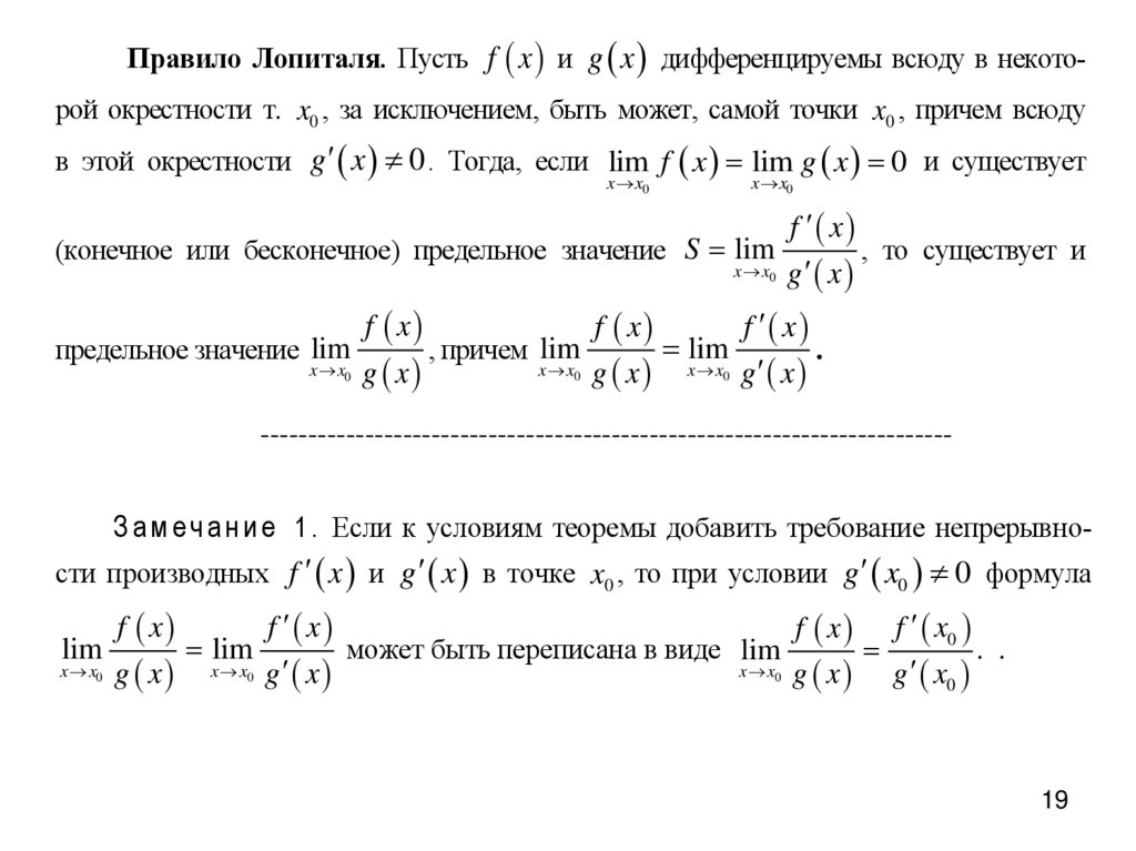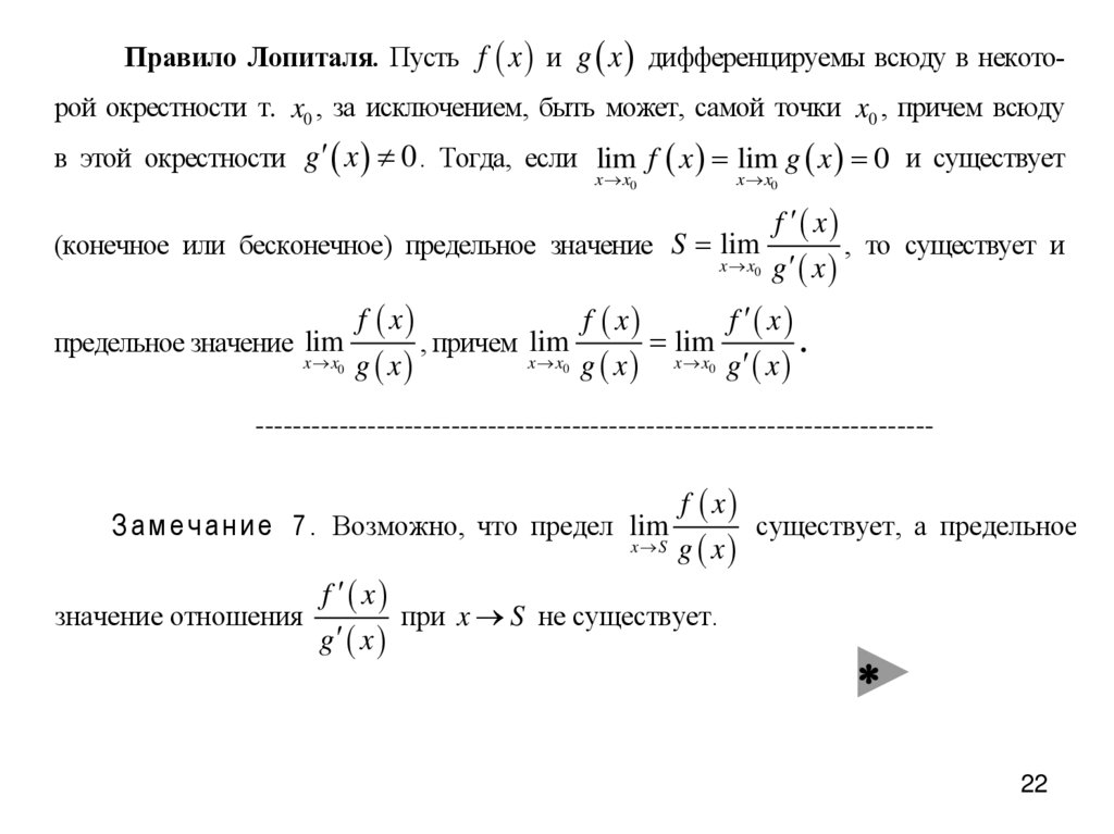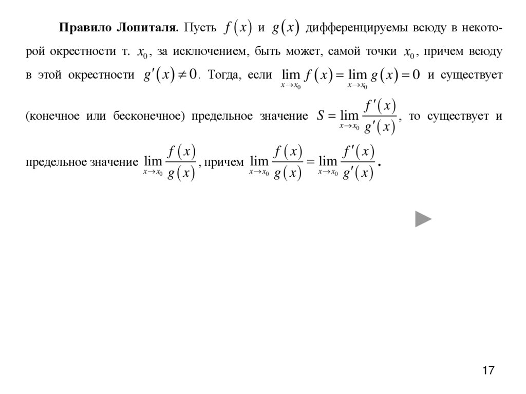 Правило Лопиталя. Пусть f x и g x дифференцируемы всюду в некоторой окрестности т. x0 , за исключением, быть может, самой точки x0 , причем всюдув этой окрестности g x 0 . Тогда, если lim f x lim g x 0 и существует