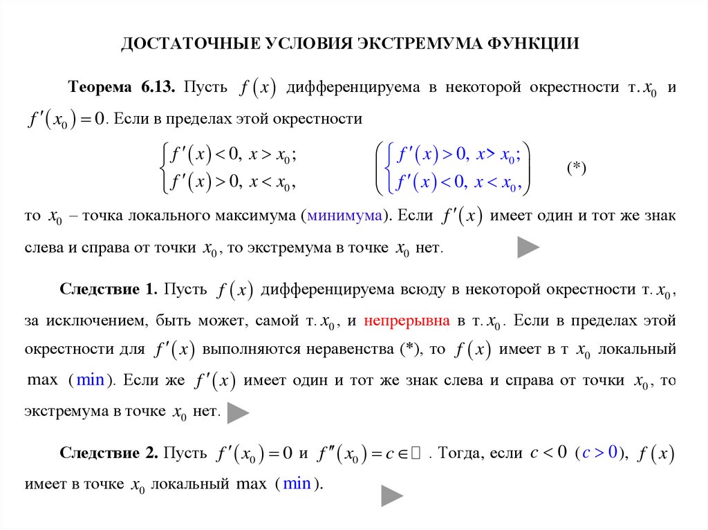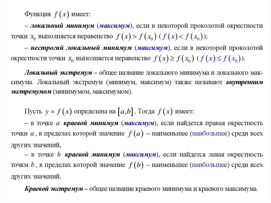 Функция f x имеет:– локальный минимум (максимум), если в некоторой проколотой окрестности