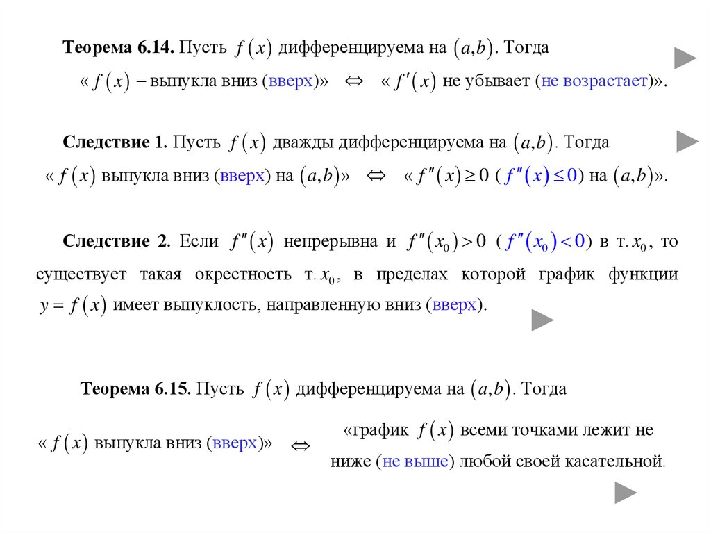 Теорема 6.14. Пусть f x дифференцируема на a, b . Тогда« f x – выпукла вниз (вверх)» « f x не убывает (не возрастает)».